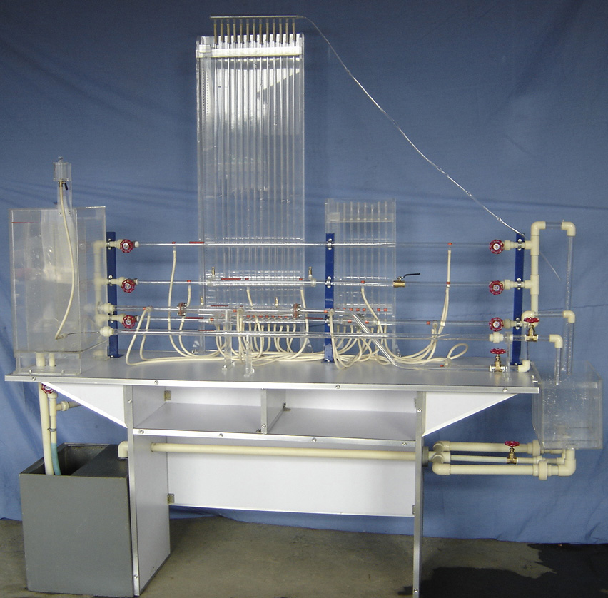 蓄水箱(PVC板)、水泵(潜水泵5800)、试验管道压力检测点、实验阀及局部构配件、计量水箱(约20升、有机玻璃板)、压计板、辅助管线(用以回流、循环等)。